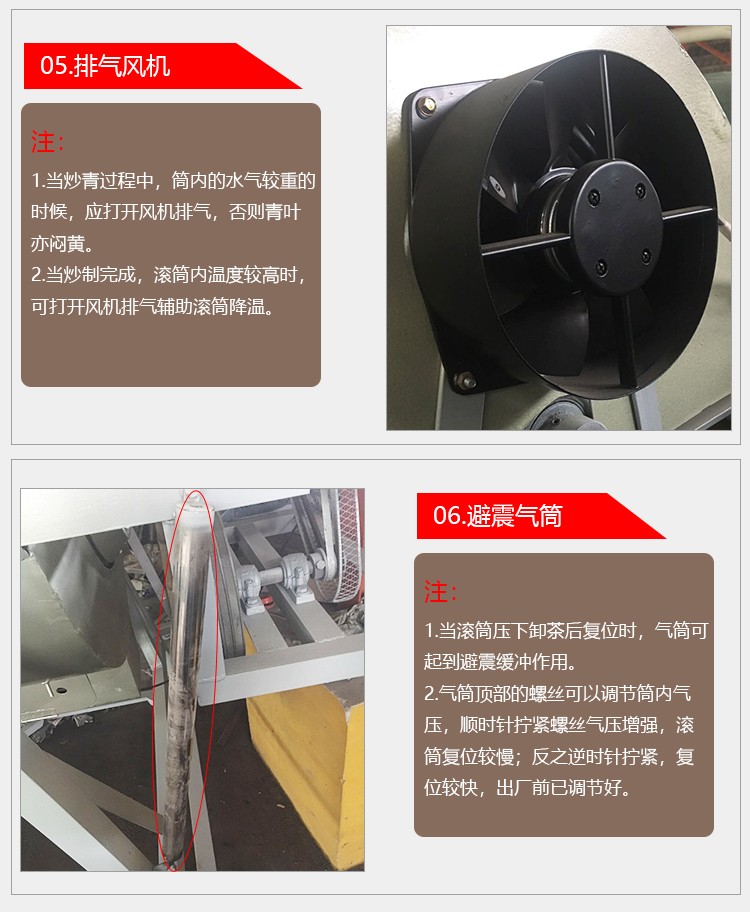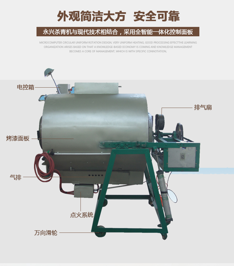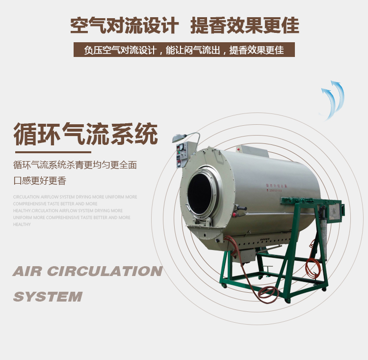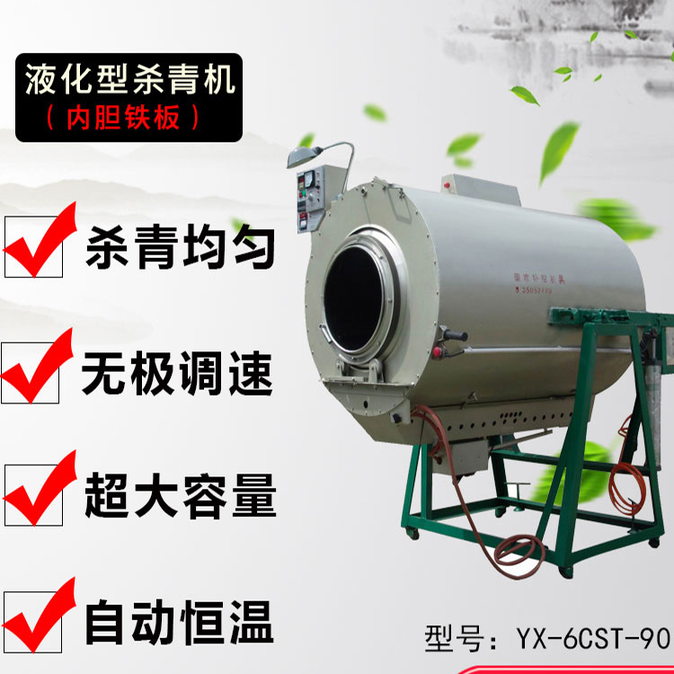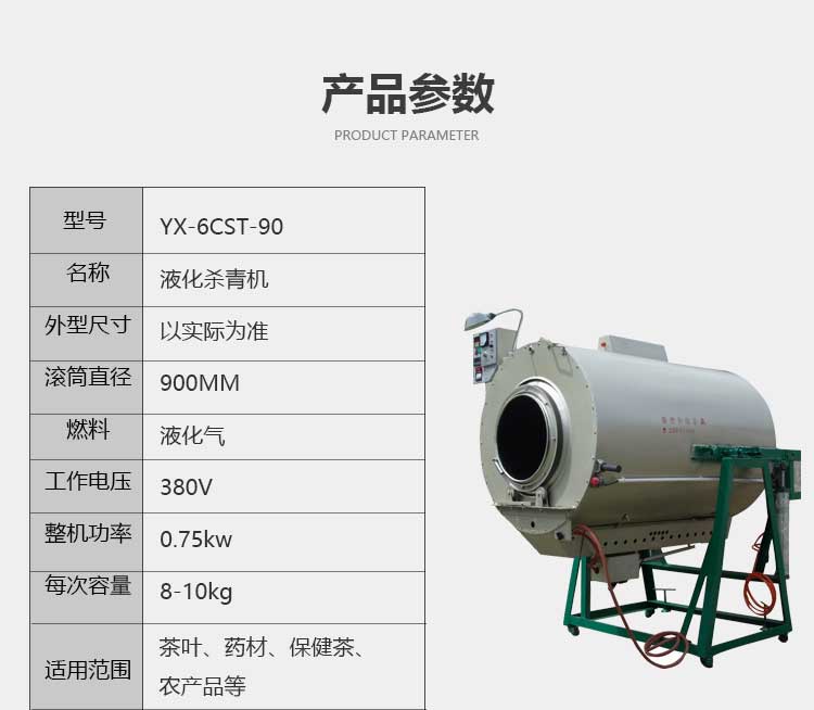 Tea Fixation Machine (By liquid gas) Model: YX-6CST-90/90B. Voltage: 380V. Power: 0.75KW. Heating method: liquid gas. Roller material: iron or stainless steel. Diameter: 90CM. Internal straight length: 1260mm/1400mm.