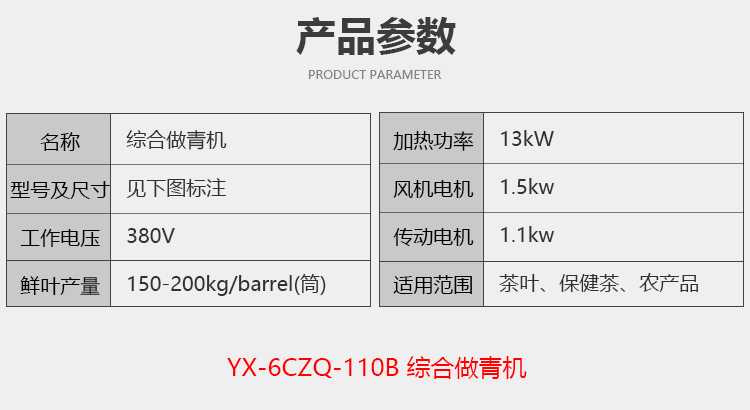 Tea rocking machine/Tea shaking machine Model: YX-6CZQ-110/110B. Voltage: 380V. Drum diameter: 110cm. Length: 3m. Roller material: iron or stainless steel. Capacity: 150-200KG. Temperature and time: You can set it according to your needs.