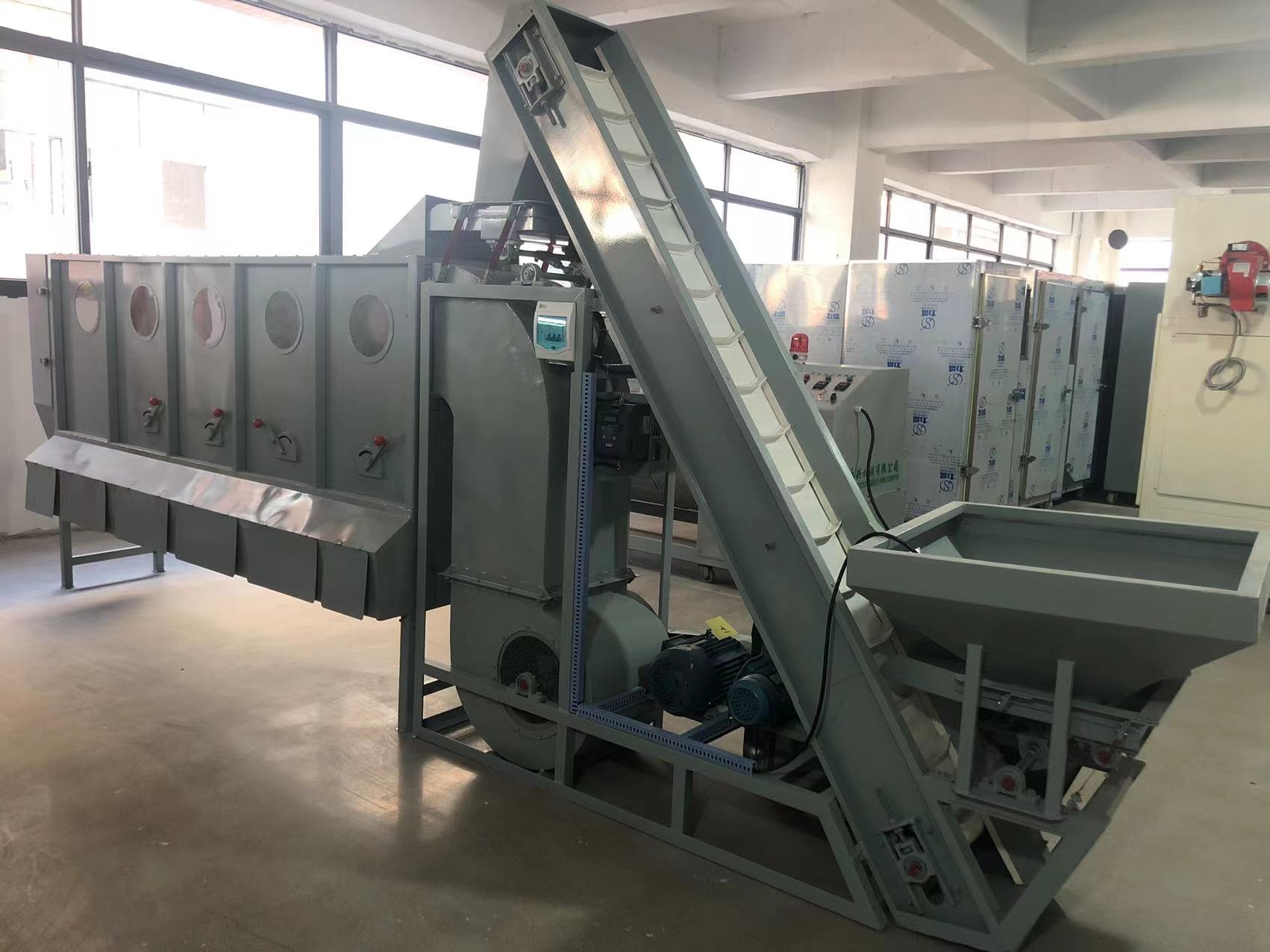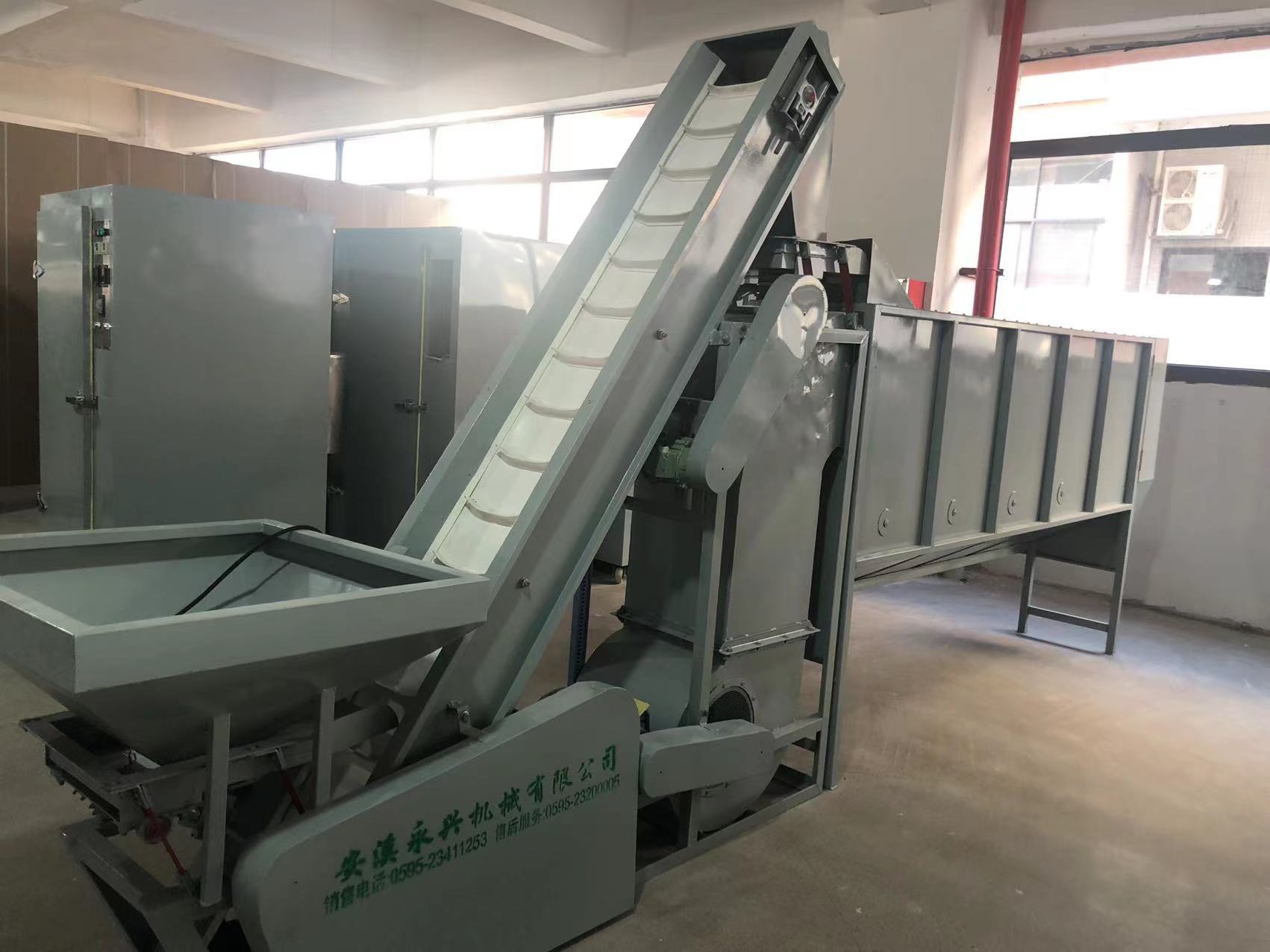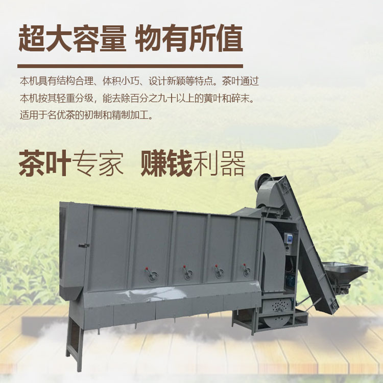 茶葉風選機 型號:YX-6CEF-40 電壓:380V. 功率:0.37+0.75+2.2kw。 原理:根據風量大小,按茶葉輕重分級。 含輸送帶提升機、儲料斗及喂料振動槽、風量變頻調速。 箱體 5 個出茶口。