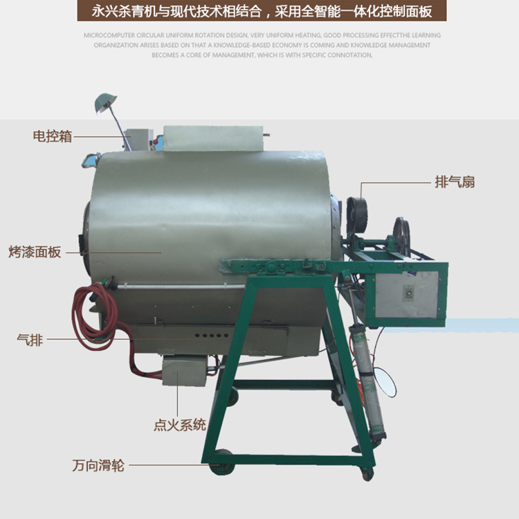 本機(jī)特點(diǎn): A、先進(jìn)的結(jié)構(gòu)和工藝,運(yùn)用嚴(yán)格的檢測(cè)體系和科學(xué) 先進(jìn)的管理制度確保產(chǎn)品質(zhì)量。 B、使用自動(dòng)恒溫系統(tǒng),同時(shí)配備了手動(dòng)點(diǎn)火裝置。 C、保溫隔熱材料采用特殊保溫材料,更好的防止了 熱量外逸,從而達(dá)到升溫迅速,節(jié)省燃?xì)饽康摹? D、轉(zhuǎn)筒采用先進(jìn)無級(jí)調(diào)速,出茶快,出茶干凈,調(diào) 速操作方便,運(yùn)轉(zhuǎn)平穩(wěn),適用于各茶類的妙制。 E、使用不銹鋼化氣排,具有殺青均勻,制優(yōu)率高等 優(yōu)點(diǎn)。 F、殺青時(shí)間設(shè)定報(bào)警。