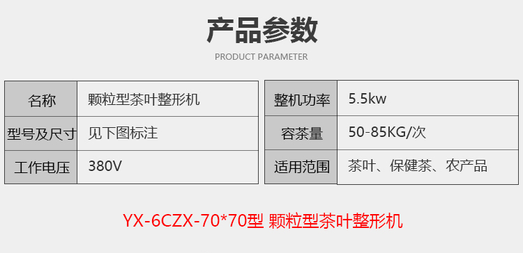 茶葉顆粒整形機(jī) 型號(hào):YX-6CZX-70*70 電壓:380V. 功率:5.5KW. 客戶也可根據(jù)需求定做自動(dòng)型,含輸送機(jī)和松包篩末機(jī),具體咨詢。